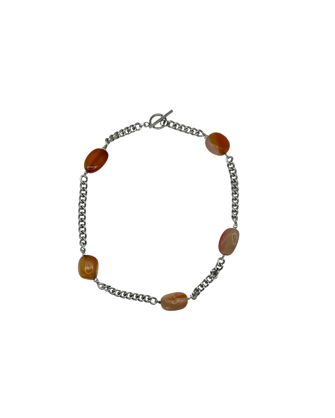 Bold and beautifully grounded, this handcrafted necklace pairs a substantial stainless steel chain with smooth, fiery carnelian gemstones, celebrating the contrast of mixed materials. Their saturated red-orange glow catches the light like sun-warmed glass; carnelian is known to evoke vitality and quiet confidence, lending a subtle boost to presence and creative energy rather than loud proclamation.