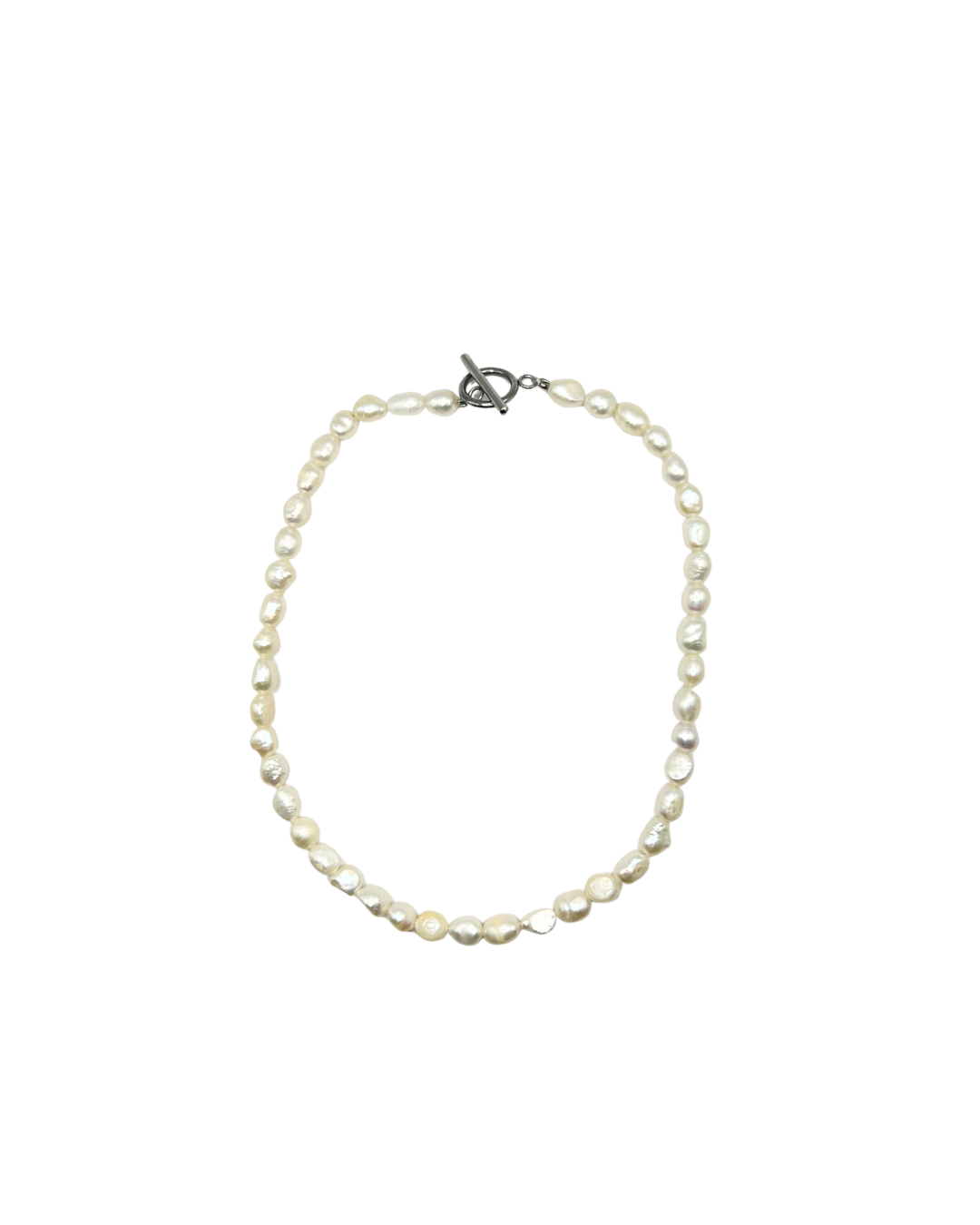 Handcrafted with lustrous freshwater pearls, this necklace exudes timeless elegance and sophistication. Each pearl is carefully selected for its smooth surface and natural sheen, creating a classic piece that reflects artisanal quality. The necklace is finished with a secure toggle clasp—available in polished stainless steel or 18k gold-plated stainless steel—for a touch of modern style and effortless wear. Durable yet refined, it’s designed to maintain its beauty and shine for years to come.