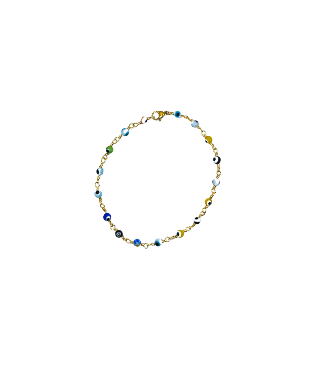 Playful yet protective, this handcrafted bracelet features a polished gold-plated stainless steel chain adorned with multiple multicolored evil eye charms. Worn across cultures for thousands of years, the eye is believed to guard against ill intent — not with force, but with quiet watchfulness. Its colors vary, but the intention remains the same: to reflect negativity back to its source.
