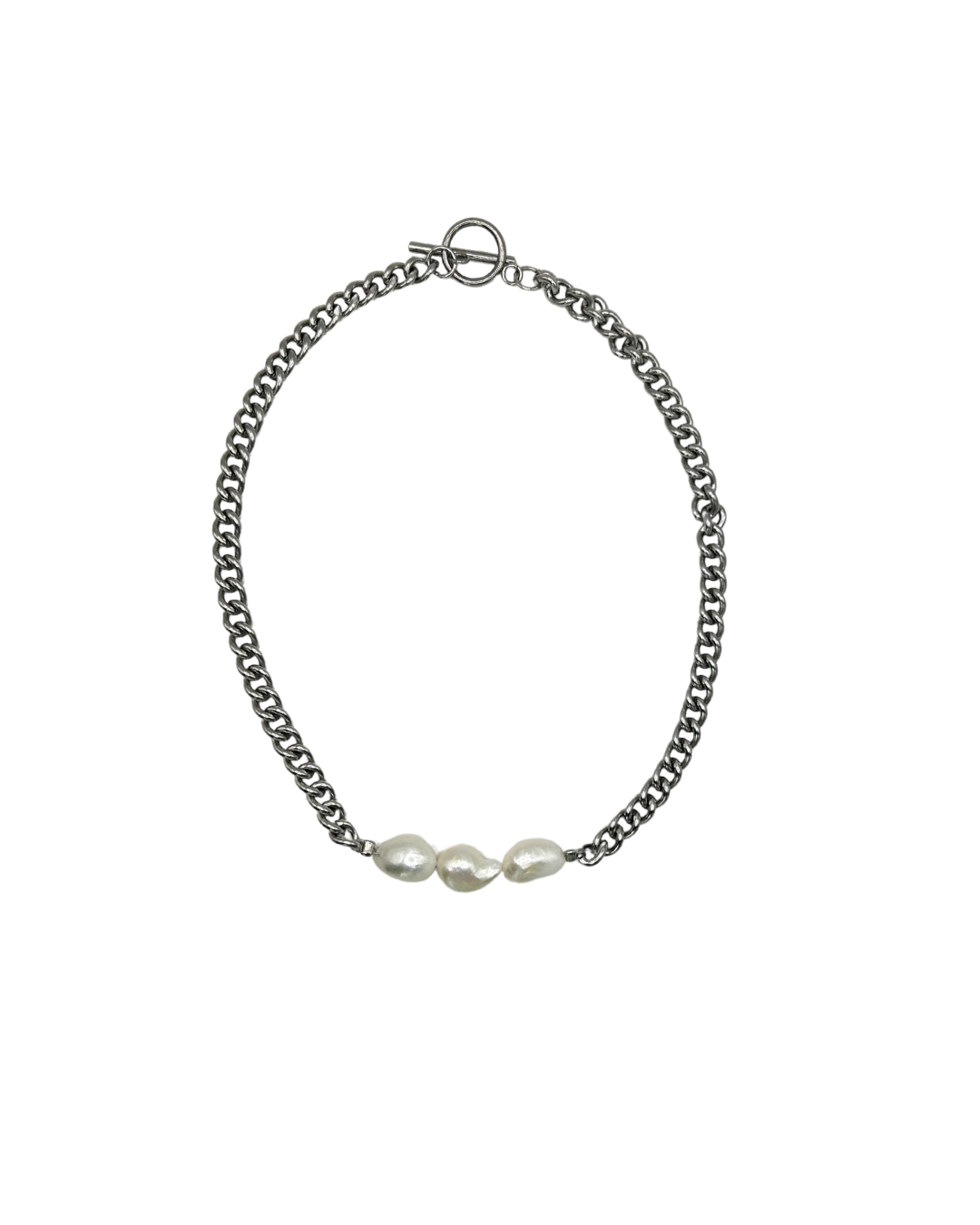 Soft yet striking, this handcrafted, androgynous necklace showcases a luminous freshwater pearl centerpiece set against a stainless steel chain, highlighting the beauty of mixed materials. The sleek metallic chain contrasts with the pearl’s gentle iridescence, creating a design that is modern, serene, and effortlessly captivating.